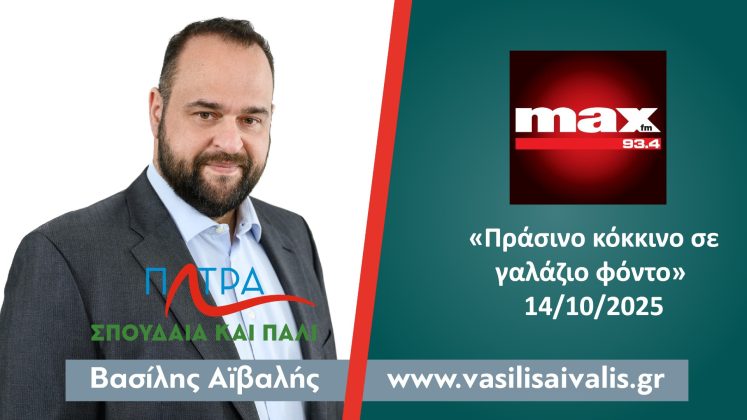 «Η τεχνική έκθεση επιθεώρησης για το κτίριο του Λιμένα Πατρών δείχνει το δρόμο, αλλά δεν αρκεί από μόνη της για τη λήψη μιας τόσο σοβαρής απόφασης.» Ο Βασίλης Αϊβαλής φιλοξενήθηκε στην εκπομπή «Πράσινο κόκκινο σε γαλάζιο φόντο» στον MAX FM 93.4, Τρίτη 14/10/2025.